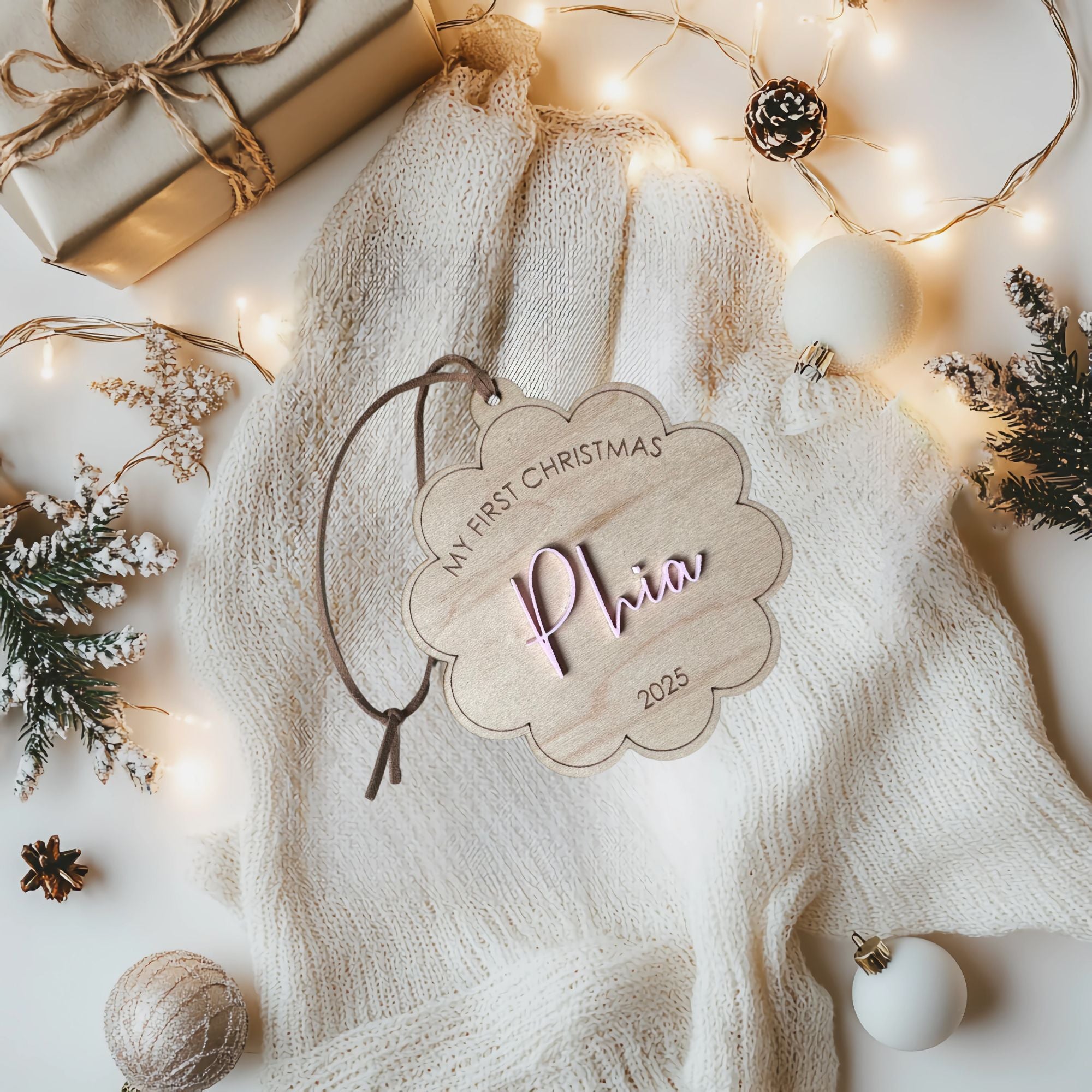 • Design: Laser engraved with My First Christmas and your child’s name in elegant script